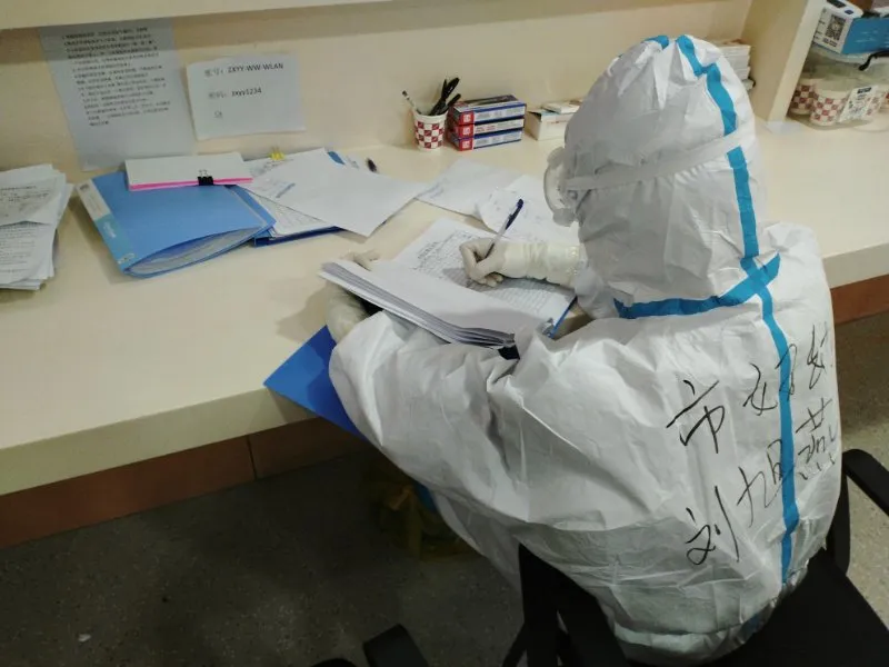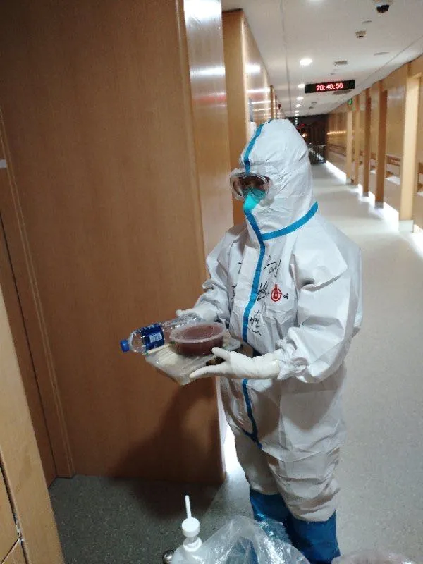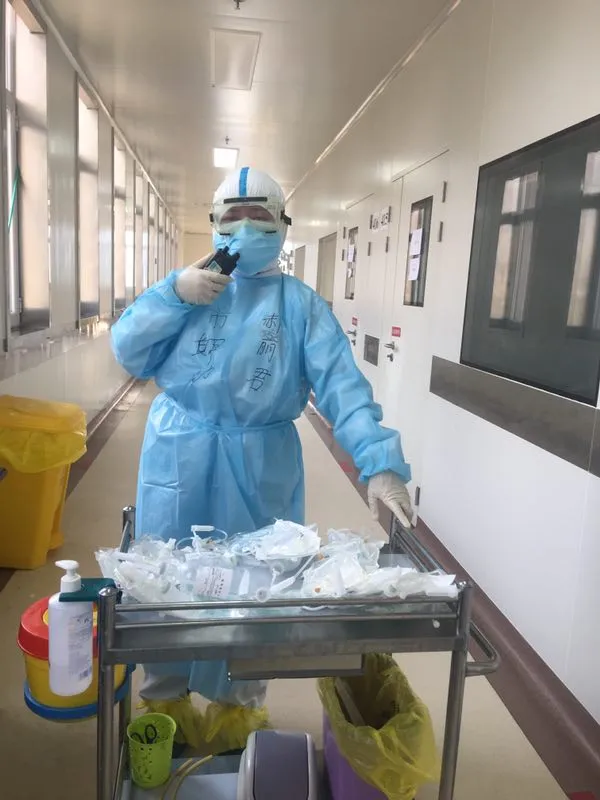 一个传递窗隔开了病区的“红区”和“黄区”。“红区”的工作需要身穿防护服,6个小时一倒班,近距离地为确诊患者进行治疗。“黄区”工作则是负责递送饭菜、填写病情记录、接医嘱及患者电铃,甚至包括帮患者取快递。