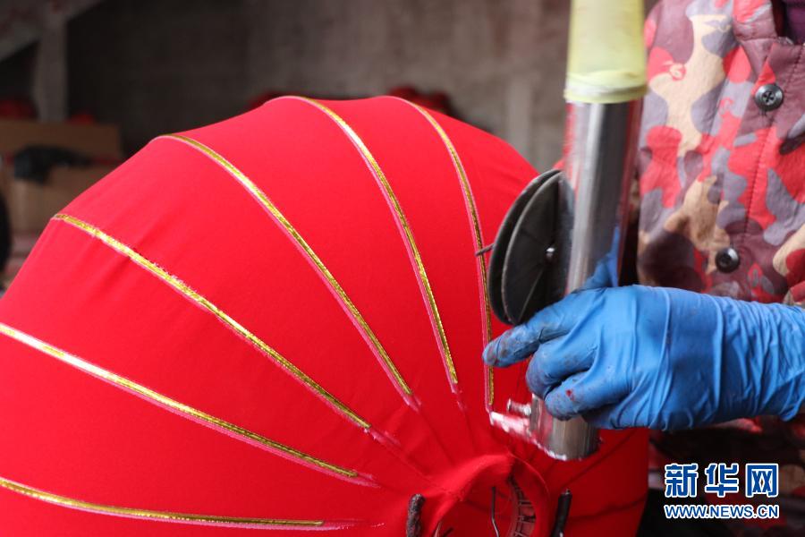 加工车间里,工人们分工明确,动作娴熟,按照穿钢丝、裁布料、缝灯面、套灯架、拉金条、晒灯笼等传统制作流程赶制灯笼。新华网 发(兰立强 摄)