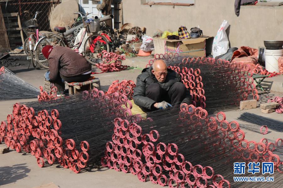 管俊刚的加工厂成立于2012年,是杨赵村规模较大的一家。临近年关,他每天都很忙,打电话、谈业务、赶制灯笼、接单发货。图为工人们正在穿钢丝。新华网 发(兰立强 摄)