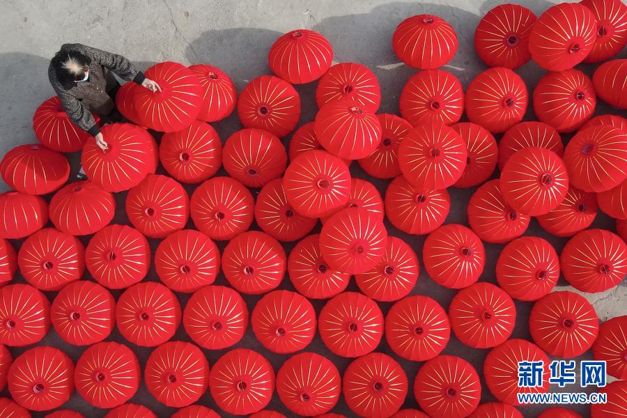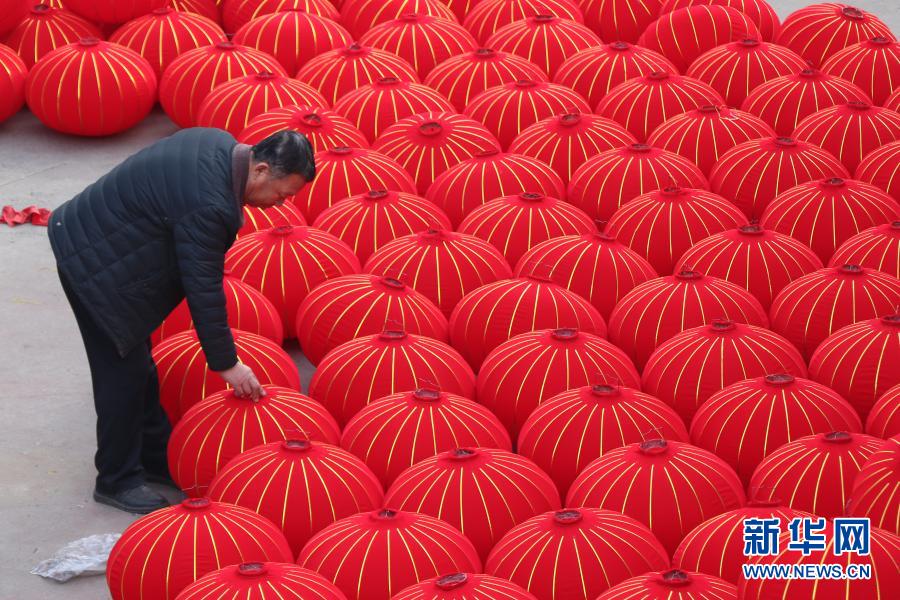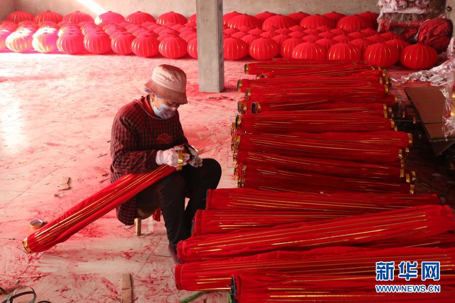 在杨赵村,从事灯笼加工制作的厂子有十几家,加上零配件生产供应大概二十家,近千人。全村每年灯笼产量1000—2000万只,产值近2亿元。一串串火红的灯笼在为人们送去新春祝福的同时,也成为当地不少村民的“致富灯”。图为工人给灯笼拉金条。新华网 发(兰立强 摄)