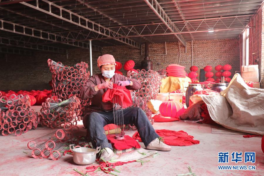 近年来,杨赵村采用“公司+基地+专业合作社+农户”的经营模式,引导加工户变“单打独斗”为“抱团发展”,发挥农户分散加工的灵活性和合作社集中销售的优势,使全村的灯笼产业走上规范化生产、品牌化经营的路子。图为工人正在套灯架。新华网 发(兰立强 摄)