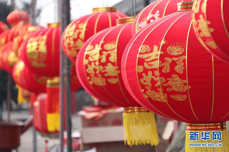 据了解,目前村里灯笼的装饰文字采用烫金发泡工艺,相比以前更艳丽、显眼,具有不掉色、不落金等特点。新华网 发(兰立强 摄)