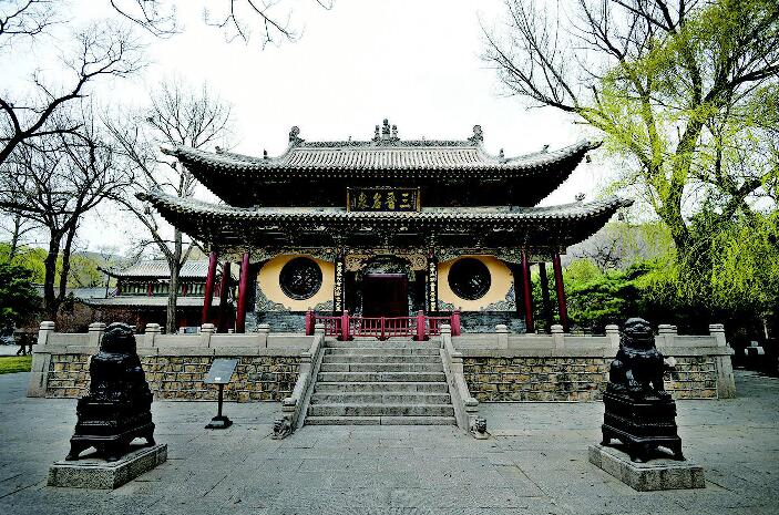 在圣母殿,游人还能看到宋朝人的样子。殿内43尊宋代彩色泥塑,大小接近真人,或洒扫梳妆,或奏乐歌舞,形象逼真,表情丰富,呈现了宋代宫廷生活场景以及当时的人情世态。圣母殿前廊柱上的木制蟠龙,雕刻于宋元祐二年(1087)。八条龙各抱一根大柱,鳞甲须髯,怒目利爪,距今近千年,仍栩栩如生,令人不禁叹服木质的优良及工艺的精巧。圣母殿的木雕蟠龙柱,也是我国现存的最早实例。
