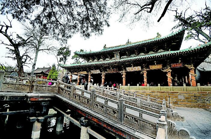 “鱼沼飞梁”,是通往圣母殿的主要通道,形制奇特、造型优美,是现存古建筑中唯一一座十字形古桥。古人称“圆形为池,方形为沼”。因殿前水塘为方形,水中又多鱼,故名“鱼沼”。“鱼沼”上方,东西桥面宽阔,南北桥面下斜如鸟之两翼翩翩欲飞,故名“飞梁”。明媚春日,立于古桥上,观赏游动锦鲤,感受春天活力,实乃趣事一件。