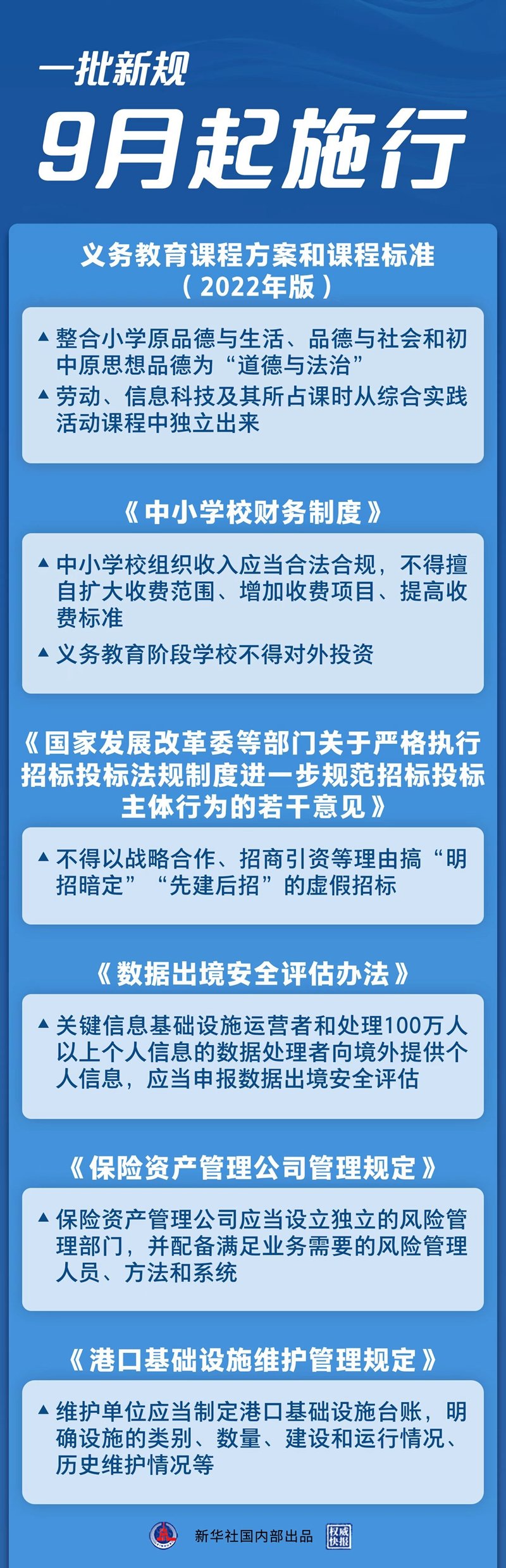 这个9月,一批新规开始施行。义务教育教学内容与方式迎来重要变化;中小学校财务制度进一步规范;招标投标新规严禁虚假招标、违法投标等行为……更完备的法治体系,护航更美好的生活。