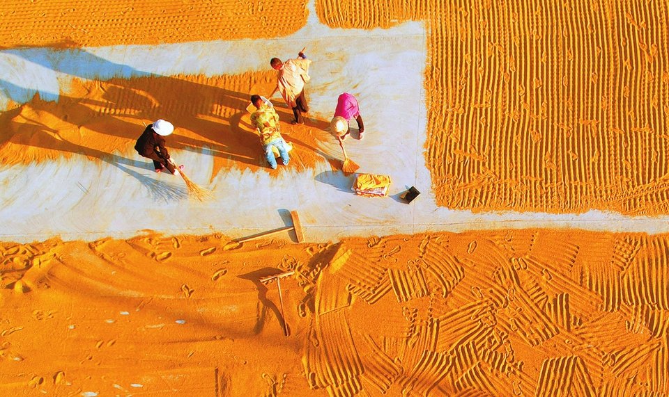 9月5日,垣曲县解峪乡原中村农民正在晾晒今年收获的新谷子。处在黄河边高塬上的这个村庄,利用当地土壤、气候规模种植谷子3500亩,成为全县优质谷业生产基地和黄河流域发展“一村一品”典型,亩均为农民增收3000余元。(崔松良 摄)