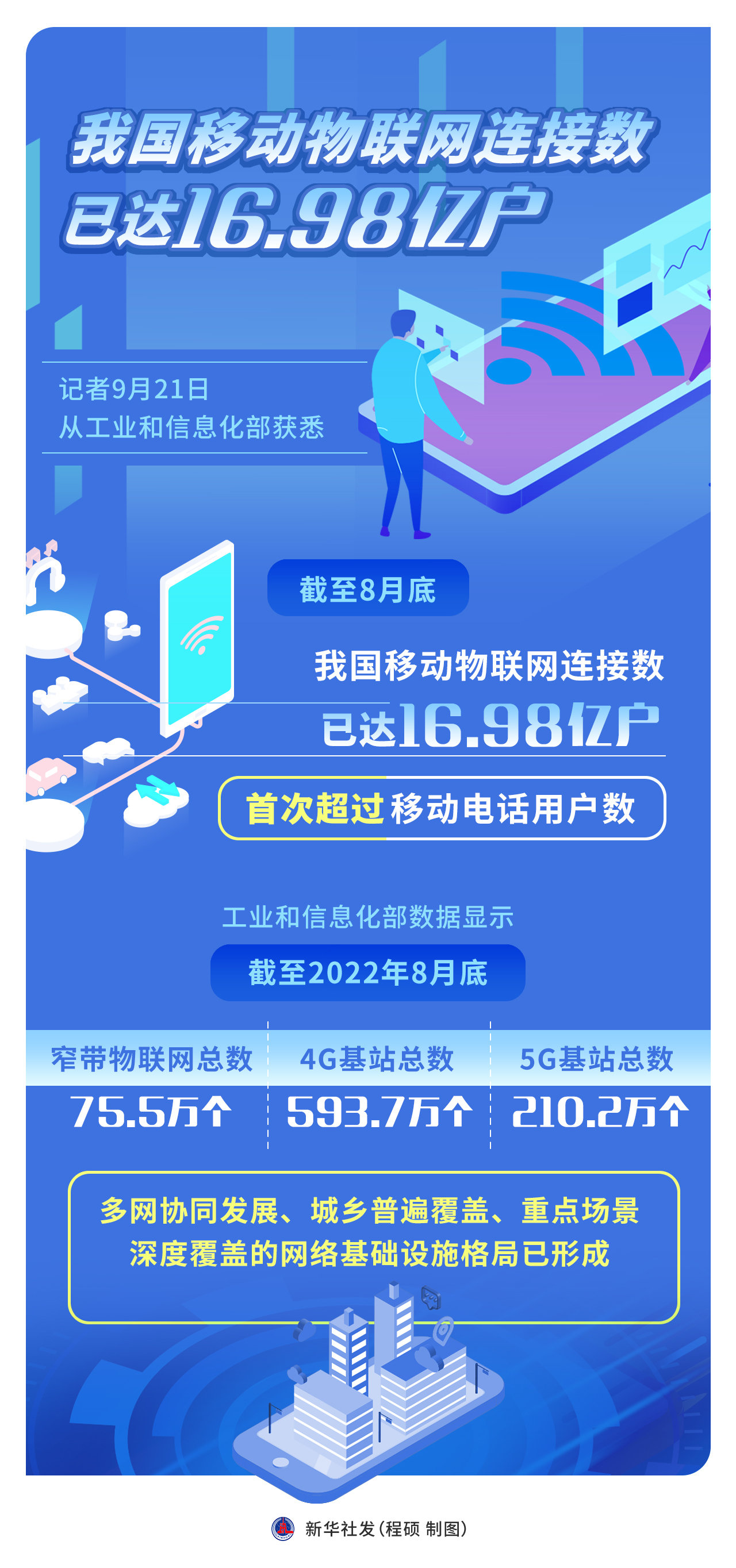记者21日从工业和信息化部获悉,截至8月底,我国移动物联网连接数已达16.98亿户,首次超过移动电话用户数。