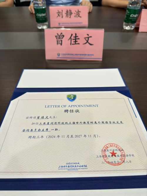 2024 年 11 月 8 日,三亚崖州湾科技城上海世外教育附属外国语学校发展咨询委员会正式成立,这是学校迈向高品质教育的重要里程碑。当天,学校举行聘任仪式,聘请致公党中央海外联络委员会委员曾佳文先生担任主席,聘期三年。校长刘静波出席仪式并发表重要讲话。