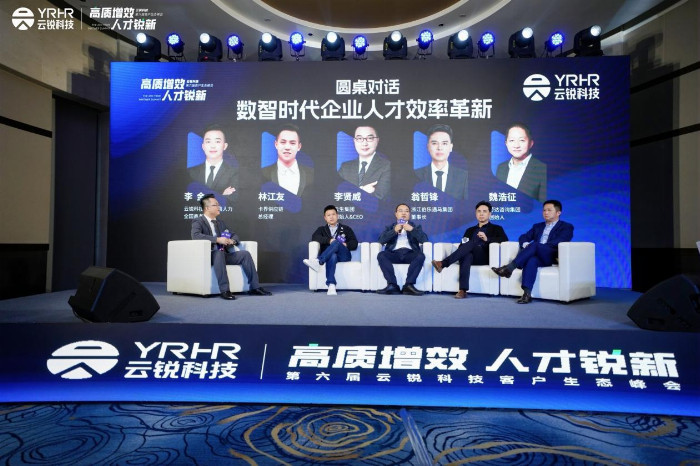 在云锐科技第六届客户生态峰会的圆桌环节中,由云锐科技真人力全国商务总监李金主持,与卡界供应链总经理林江友、云生集团创始人李贤威、浙江伯乐遇马集团董事长翁哲锋、劳达咨询集团创始人魏浩征深入探讨了《数智时代下人才效率革新》。其中林江友提到了与云锐科技合作的收获,对于客户第一的美好服务体验有很深的合作感触。魏浩征则强调了组织能力建设的重要性,并对云锐科技的组织能力给予了高度评价。圆桌环节还涉及了如何通过内部孵化和合伙人制度激发员工的创新精神和工作热情,以及如何利用数字化工具和平台优化人才管理。
