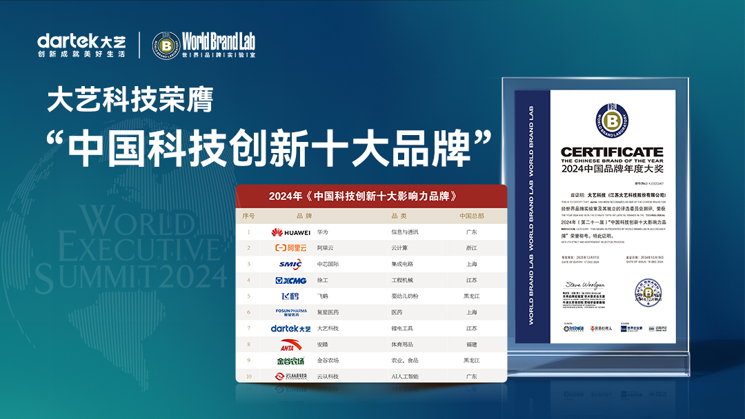 今年8月,大艺科技荣登GYBrand“全球锂电工具品牌价值10强排行榜”,本次再度入选“中国科技创新十大影响力品牌”,不仅体现了国内外专业评审专家对大艺科技的高度认可,更彰显了大艺科技在市场领导力和品牌影响力方面的持续提升。