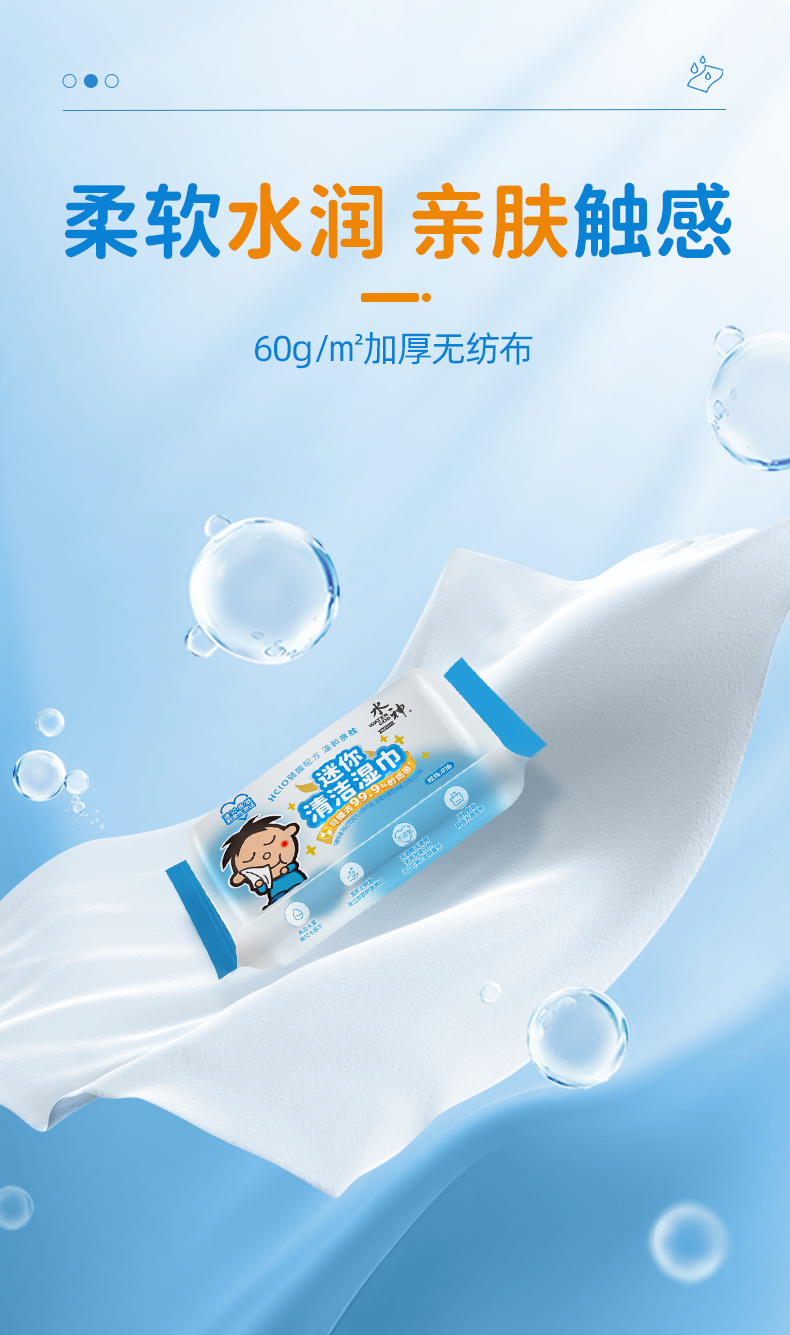 水神迷你清洁湿巾采用HCIO弱酸配方,可擦除99.9%的细菌,通过皮肤刺激测试,用得安心,擦得放心。