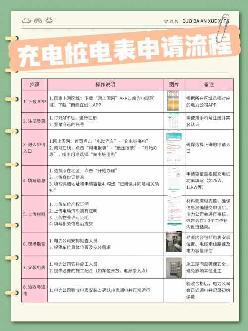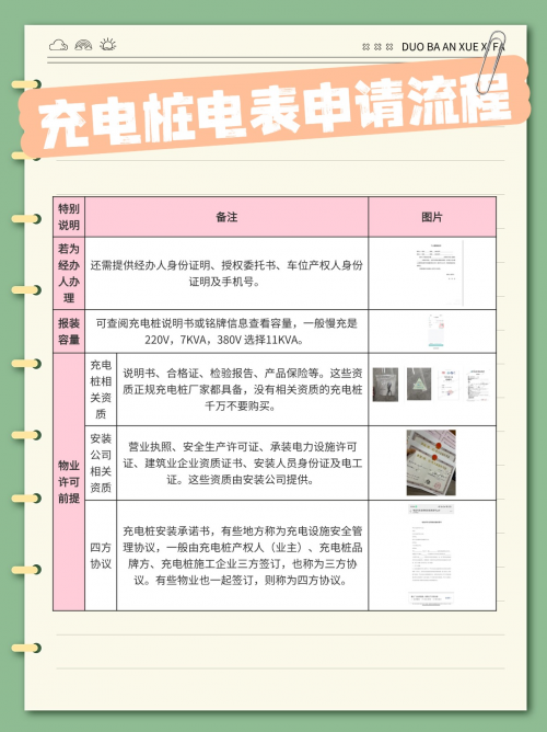 准备包含车位位置、周边环境及电表位置的平面图或高清照片,这些资料将为电力部门工作人员进行现场勘测和规划提供有力支持,有助于更高效、精准地完成后续安装工作。