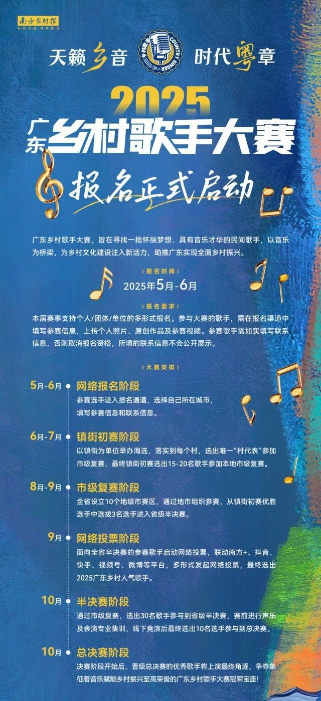 本届大赛以“天籁‘乡’音 时代‘粤’章”为主题,旨在以音乐为媒创建助力“百千万”,聚力唱响新乡村。赛事设网络报名、镇街初赛、地市复赛、网络投票、半决赛及总决赛六大环节,持续开展至10月底,现网络报名正火热进行中。