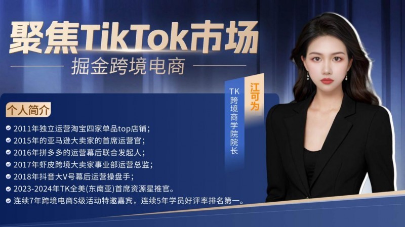 2018年至今,江可为致力于跨境电商教育事业,担任TK跨境商学院院长。她将自己多年的实战经验与行业洞察相结合,开发出了系统的跨境电商课程。这些课程不仅涵盖了平台运营、供应链管理、营销推广等核心内容,还结合了最新的行业趋势,帮助学员快速掌握跨境电商的核心技能。