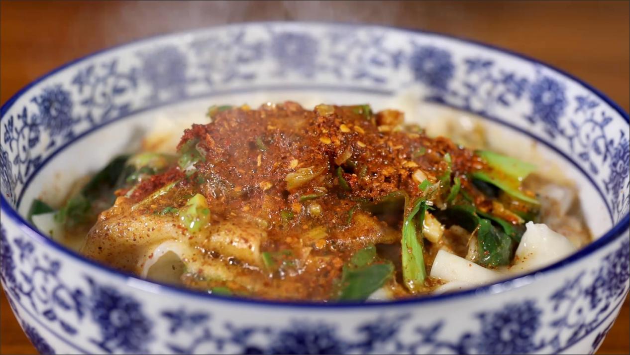 宽面煮熟捞入碗中,铺上干辣面、蒜末、葱花,一勺滚烫的热油“滋啦”一泼,瞬间腾起诱人的焦香。搅拌均匀后,每根面条都闪烁着红亮油光,蒜香、面香、辣香直钻鼻腔。吃时务必配上一颗生蒜,辛香激发出更深层次的面香,吃得人大汗淋漓、畅快无比。