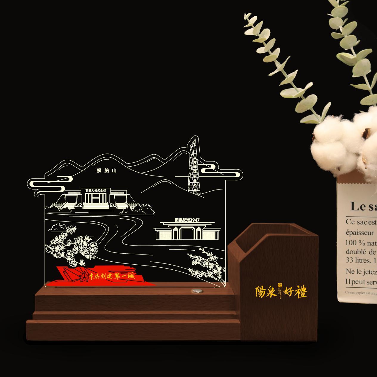 一方礼盒,承载着“中共创建第一城”的星火传承。设计融汇百团大战纪念碑、阳泉记忆1947文化园等阳泉地标,将红色文化与地域风貌相结合。兼具笔筒与手机支架功能,内置智能触控开关与锂电池,让红色记忆融入生活日常,使革命精神在案头薪火相传。