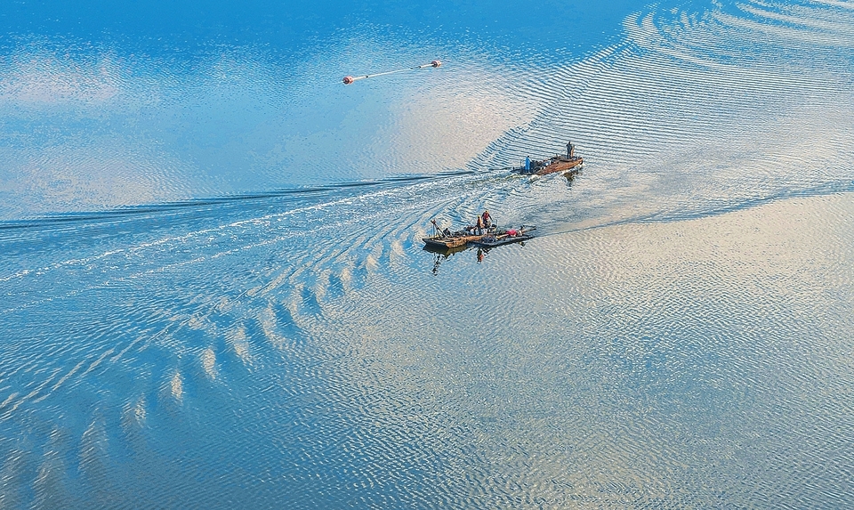 11月18日,运城永济伍姓湖内,工作人员正操作大型清淤船开展清淤及生态治理作业。近年来,永济市实施系统化生态治理,推动伍姓湖由生态退化区蝶变为水鸟栖息的乐园和市民休闲游玩的理想场所。(程永仁摄)